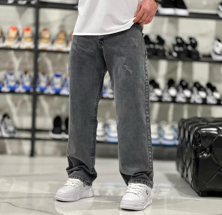 شلوار بگ مردانه ذغالی روشن زاپ سطحی پارچه جین کجراه